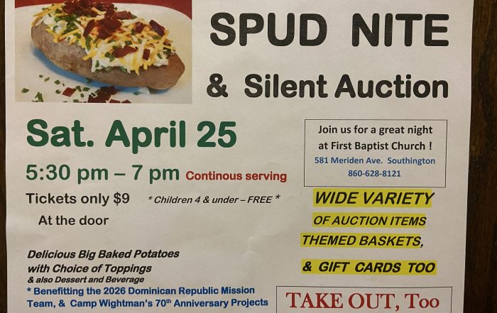 The Spud Night & Silent Auction is being presented on Saturday, April 25 from 5:30 to 7 pm., at First Baptist Church of Southington, 581 Meriden Ave. Spud Night features a choice of baked potatoes [...]