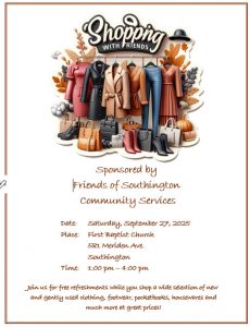 The one-day bazaar, “Shopping with Friends,” will be held Saturday, Sept. 27 sponsored by Friends of Southington Community Services. This fundraiser will be held from 1 to 4 p.m. at First Baptist Church of Southington, 581 Meriden Ave. There is no admission fee.