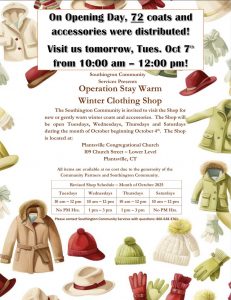 Did you know that Southington Community Services is offering free winter coats and winter wear through October? Their “shop” is located at Plantsville Congregational Church, 109 Church St. Check out the details in the flyer! (This graphic is from earlier in the month.) As of Oct. 12, 131 coats had been distributed!